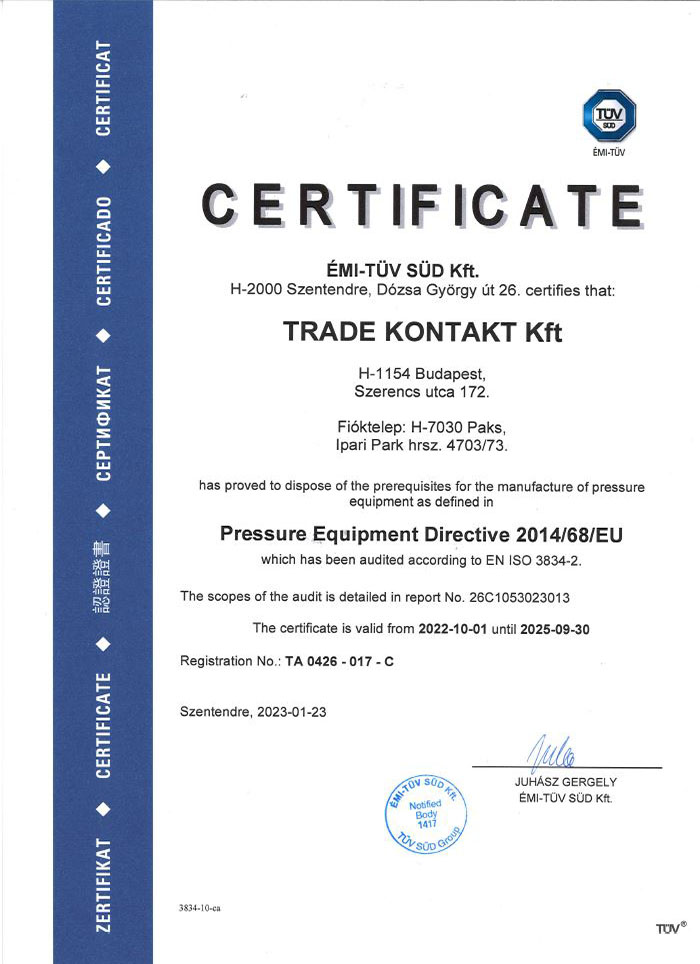 ООО «ТРЕД КОНТАКТ» было основано в 1993-ем году, его основная сфера деятельности – это монтаж на месте оборудования и трубопроводов для промышленного назначения и для атомных электростанций. Рост количества наших заказов, нехватка рабочей силы и постоянное повышение качества услуг, обеспечиваемых нами, делали необходимым, чтобы мы приладили наш состав средств к сегодняшним технологическим требованиям, при этом мы купили новые сварочные станки. Покупка средств была выполнена в рамках Проекта Евросоюза под номером идентификации GINOP-2.1.8-17-2017-00511, в результате которого были куплены 4 сварочных станка типа OERLIKON CITOPULS III 520, сварочные генераторы типа ORBIMAT 300CA COMPACT в количестве 2-х штук и сварочные станки типа ORBIMAT P16 для сварки наконечников труб. Полный расход приобретения средств составил нетто 38.862.760 Фт, из которого поддержка, обеспеченная Евросоюзом и Государством Венгрии составила 14.708.218 Фт.